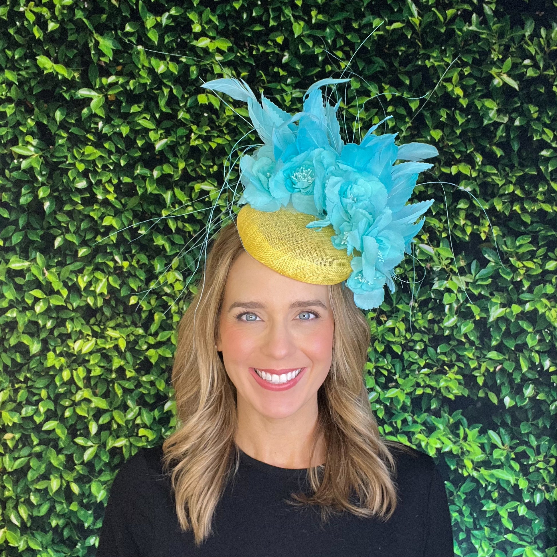Aqua blue flowers and feathers on a yellow sinamay hat base
