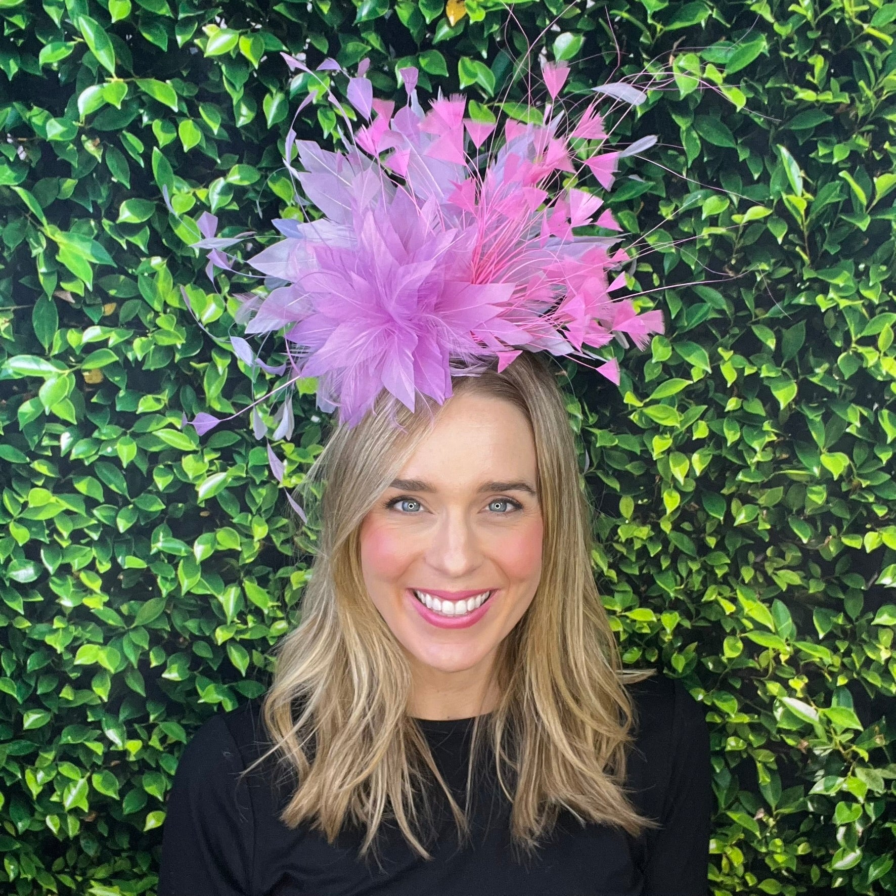 Pink purple, light purple, and medium pink feather fascinator on a satin covered headband.